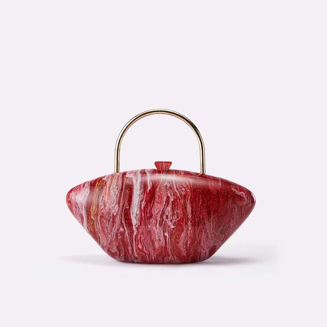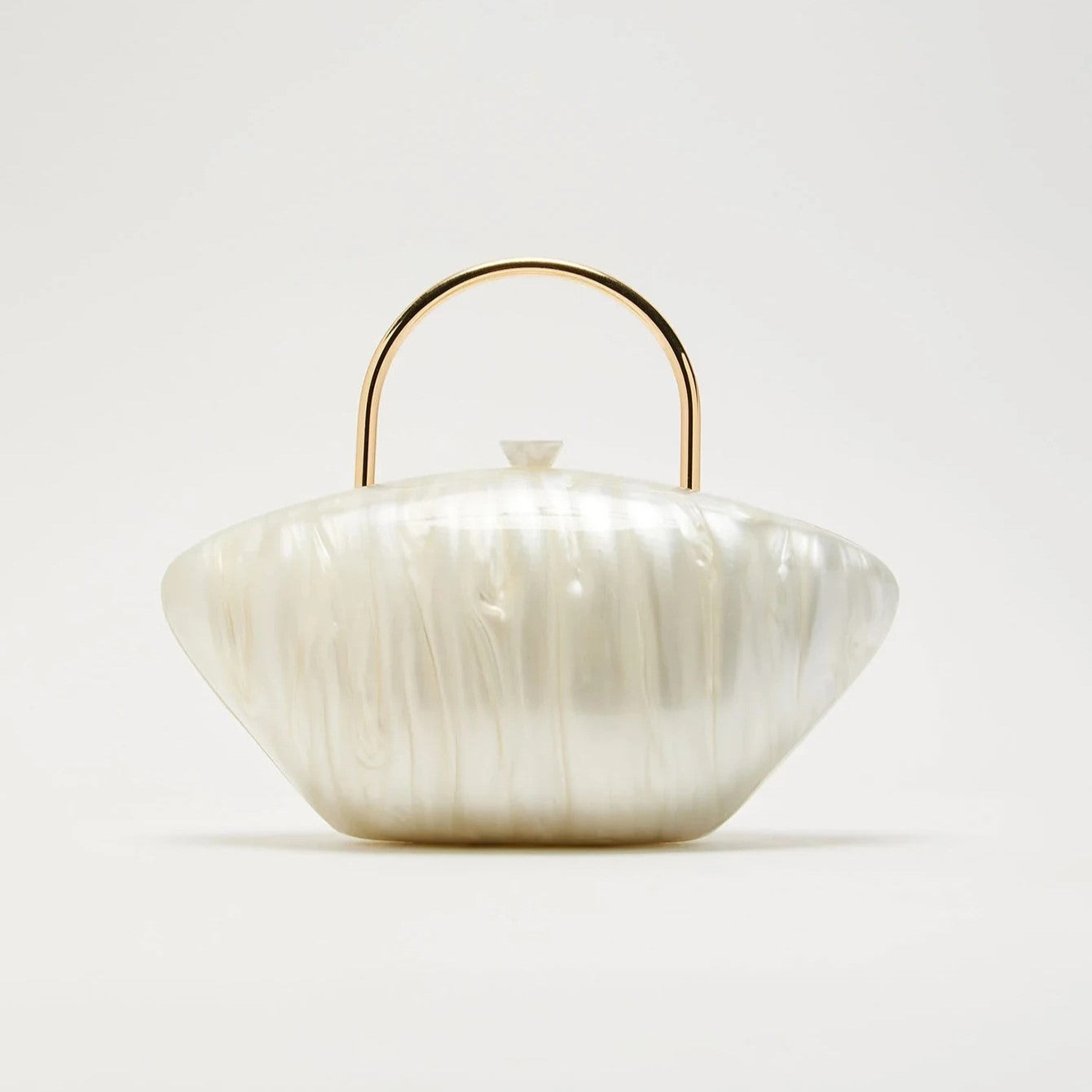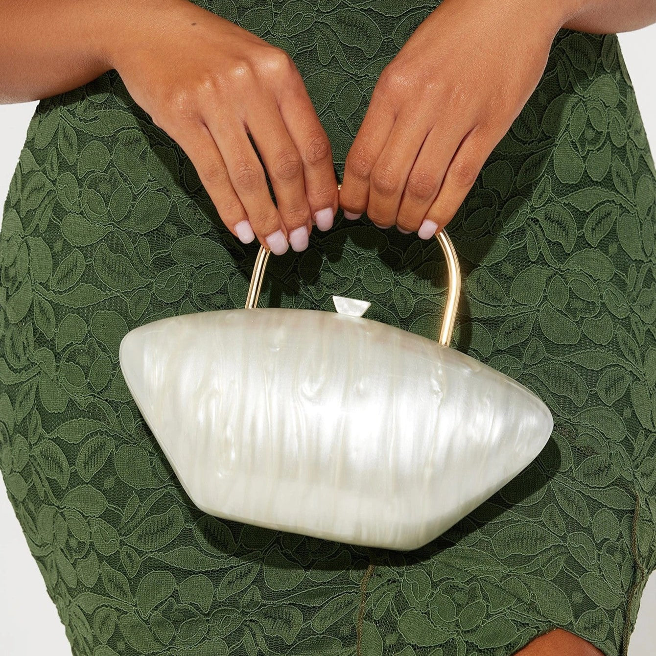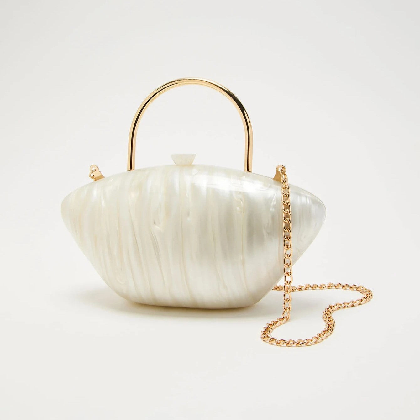 BIANCA, a sculptural showpiece that blends European elegance with bold modern design. Crafted from high-quality, marble-like acrylic, this shell-inspired evening bag is designed to catch the light and attention—at every angle. Its solid, high-texture body exudes luxury while offering enough space for your evening essentials.