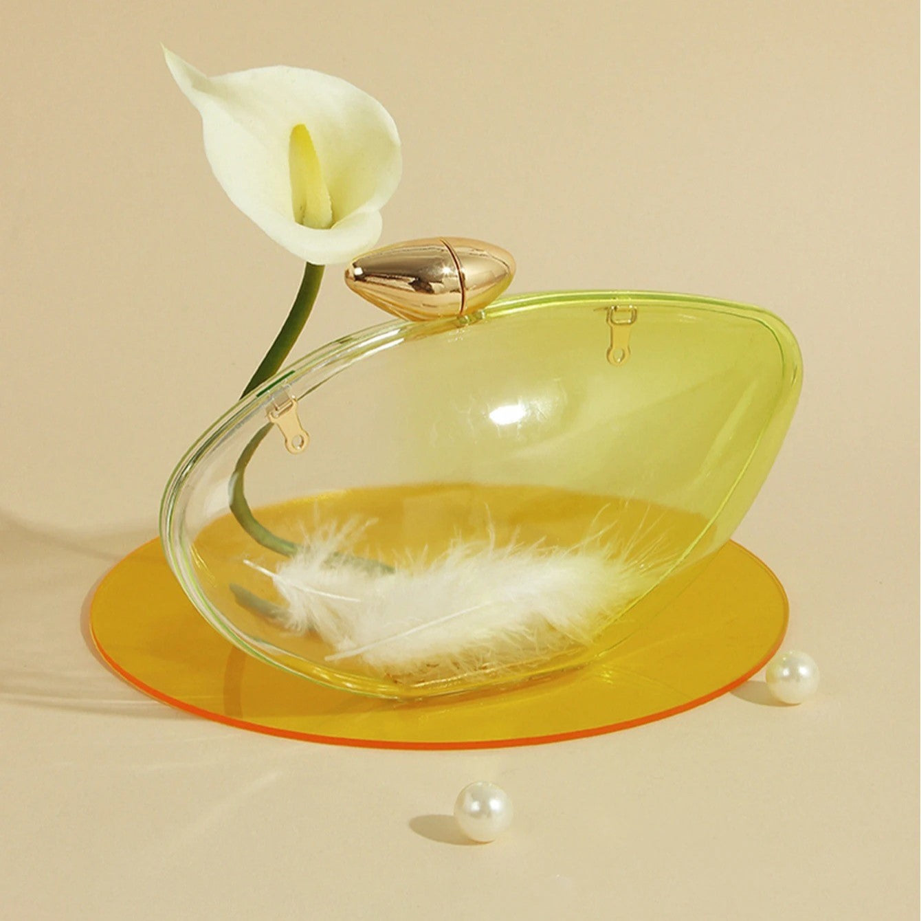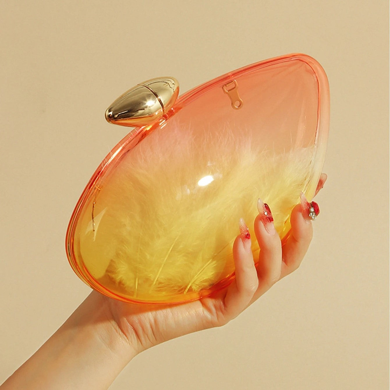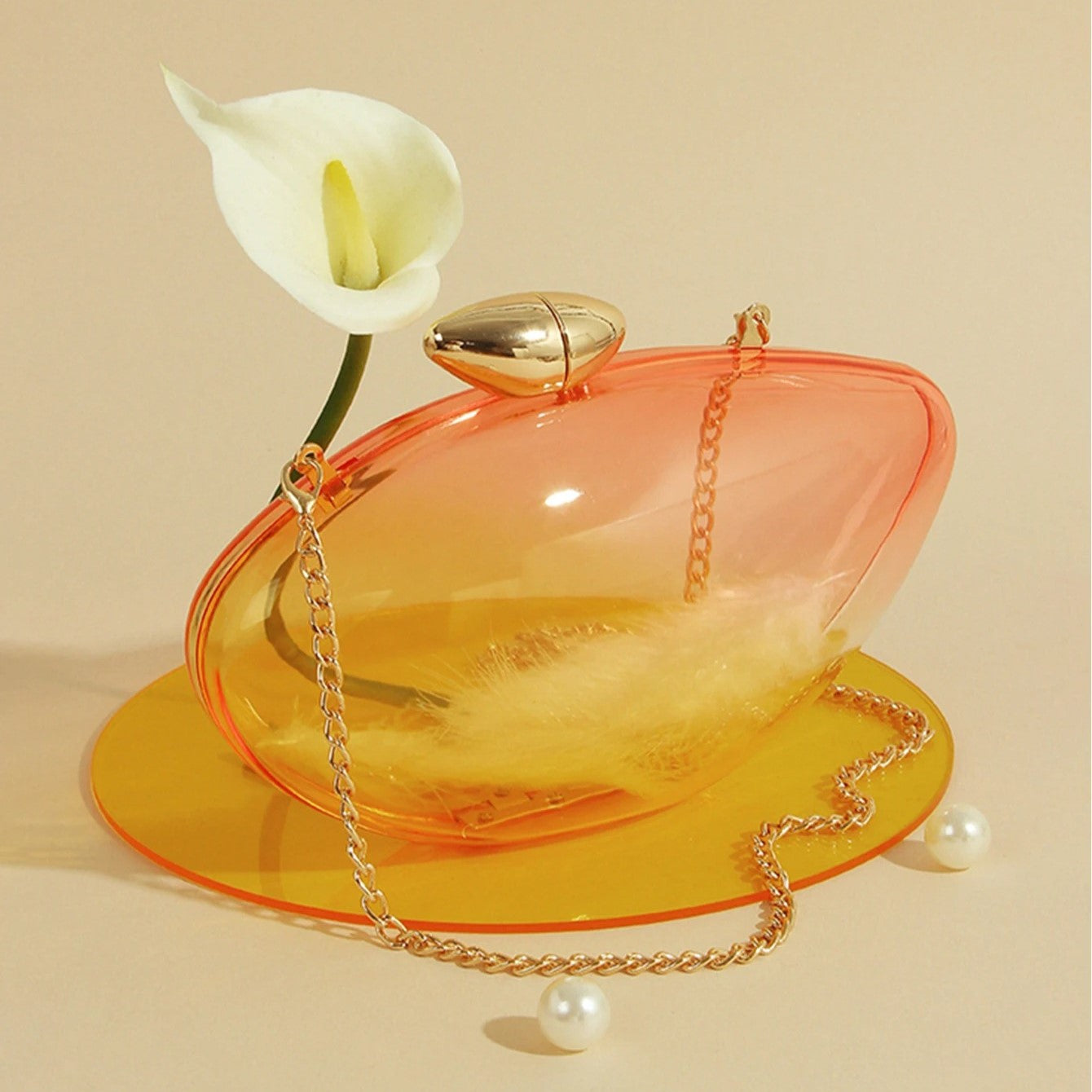 Dreamy, compact, and unforgettable—LUNA is a transparent acrylic clutch with soft gradient tones that shimmer like moonlight. Designed in a sculptural shell silhouette, this mini banquet bag is the perfect accessory to elevate your evening look with a playful yet sophisticated edge.