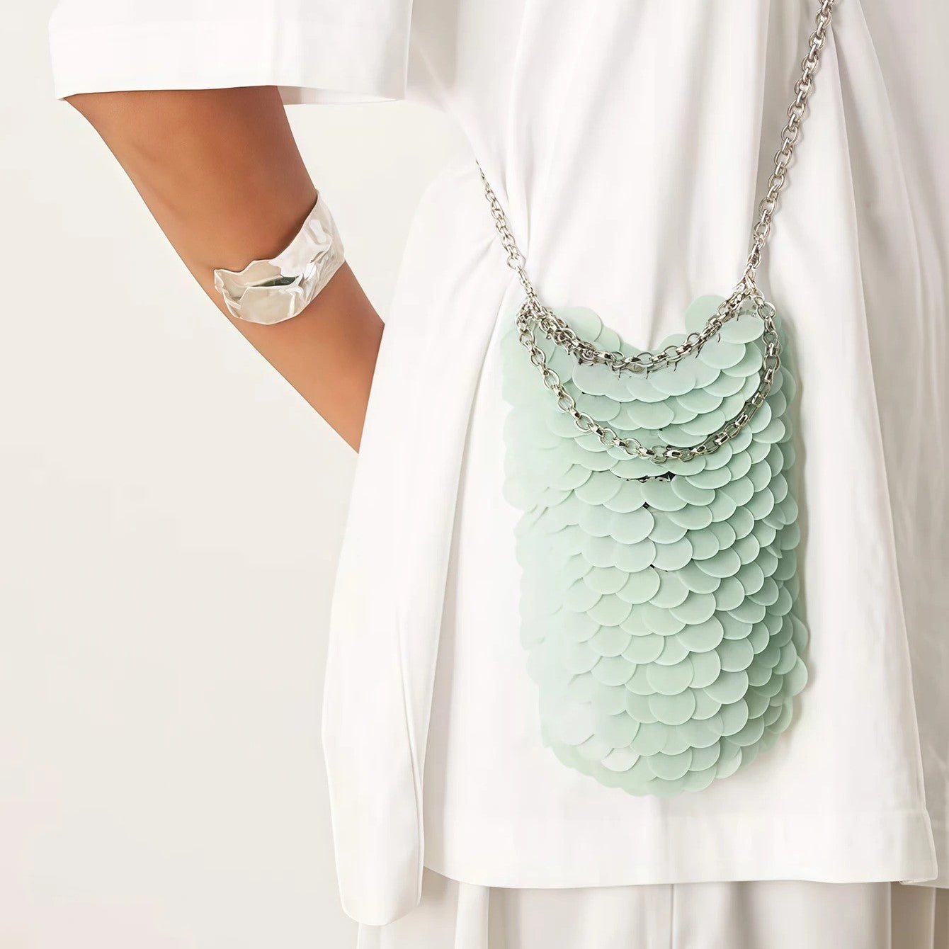 Turn every entrance into a statement with SÉRAPHINE, a dazzling handbag that shimmers like a mermaid’s dream. Covered in layered, fish-scale-inspired sequins that catch the light at every angle, this chic clutch is made for glamorous evenings. The detachable chain strap offers styling versatility—carry it by hand for a polished touch or wear it on the shoulder for effortless elegance.