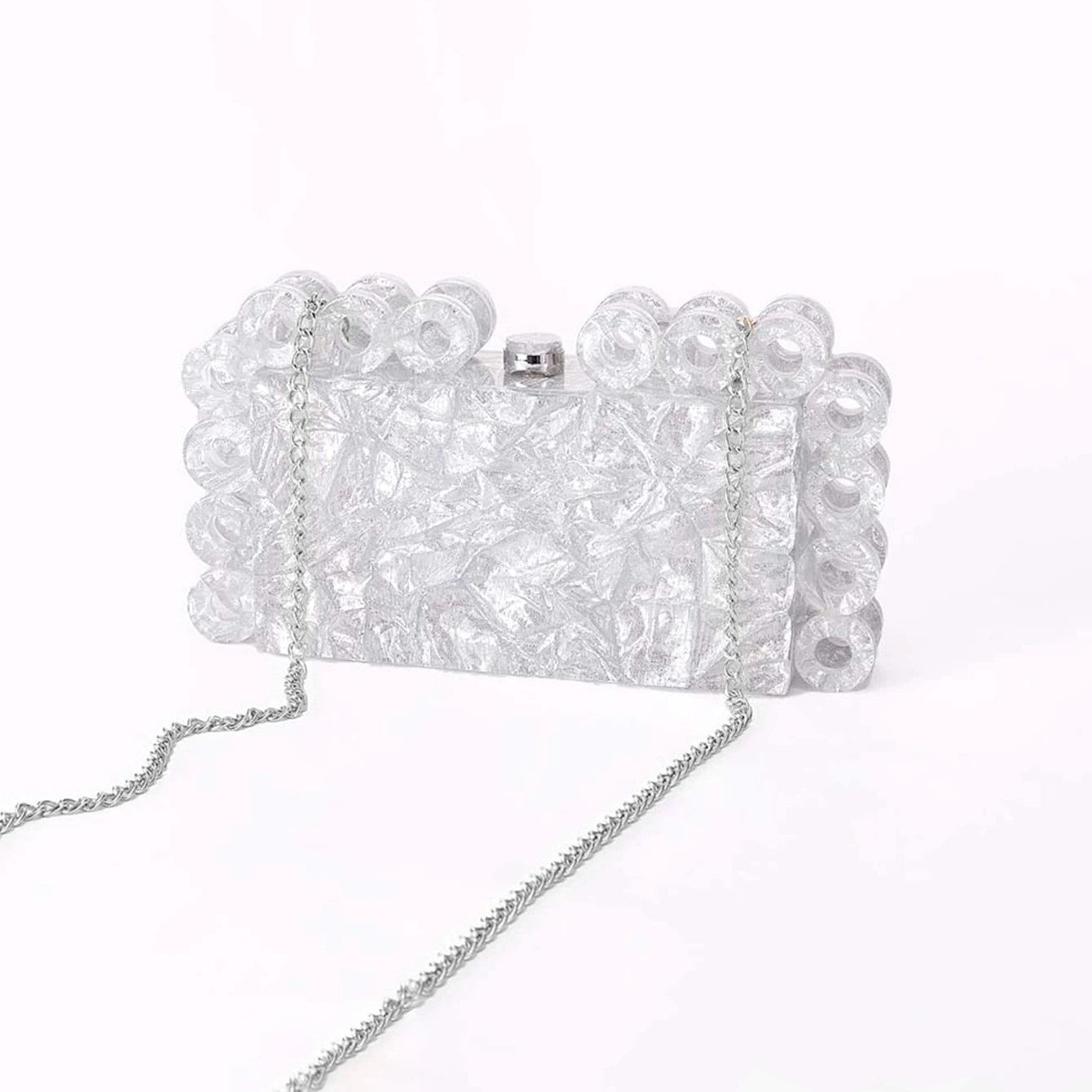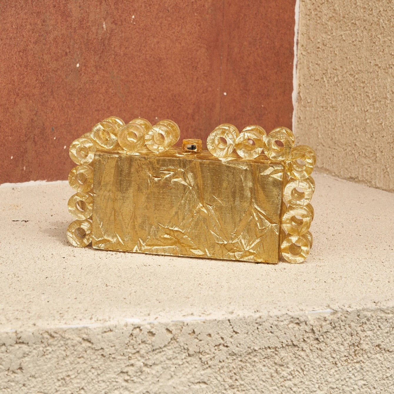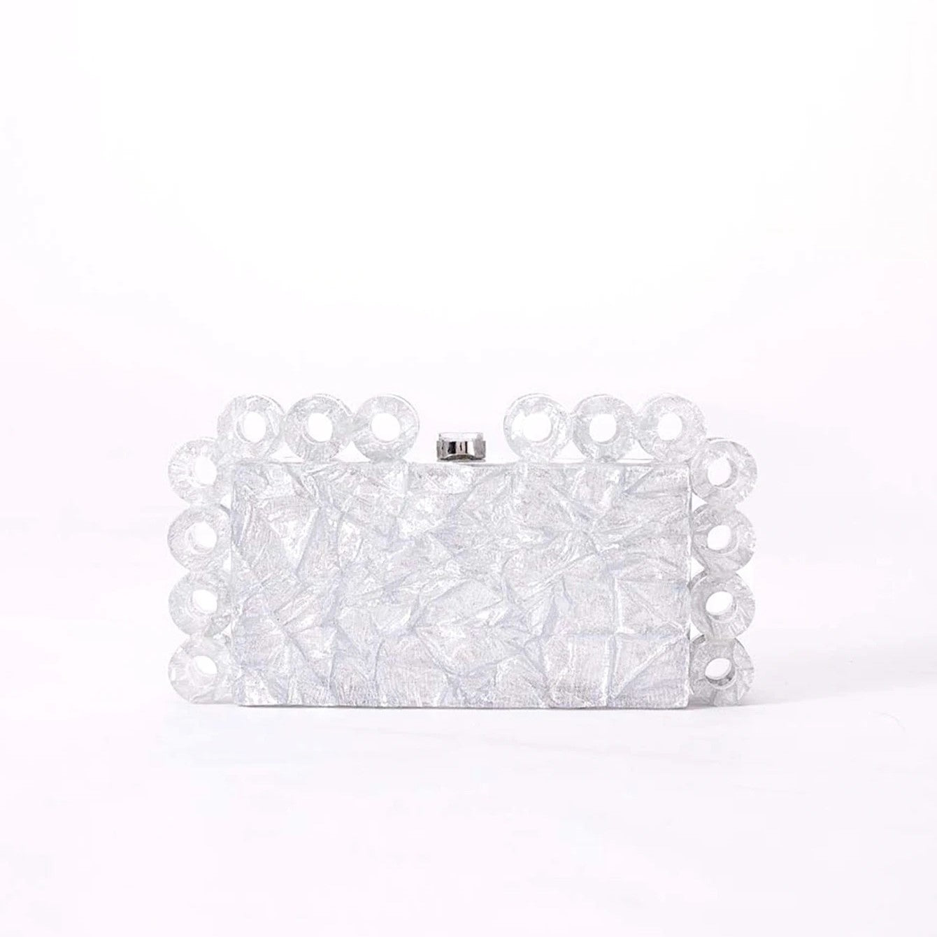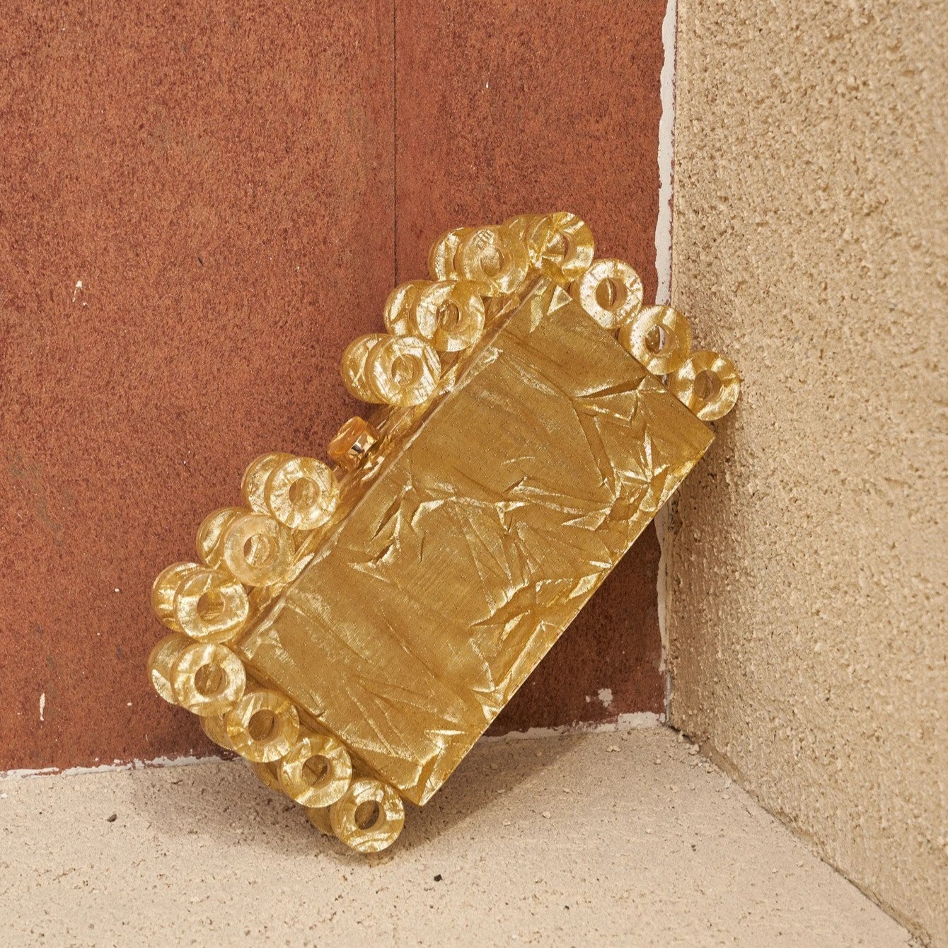 Make a luminous statement with SOLANA, a retro acrylic clutch that blends bold geometry with golden glamour. Featuring a unique round silhouette encased in a structured square shell, this mini bag is equal parts art and accessory—perfect for elevating your evening wardrobe.