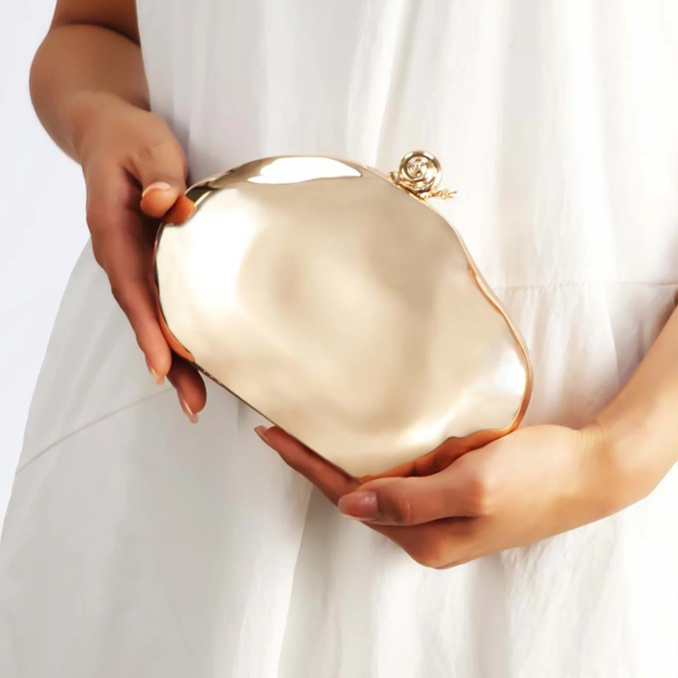 Classic meets contemporary in VIVIENNE, a striking metallic oval box bag crafted with a mirror-like hard shell and delicately textured finish. The gleaming exterior reflects light with every move, while the vintage-style chain handle adds timeless elegance. Perfect for glamorous evenings, red carpet events, or upscale dinners, VIVIENNE is the finishing touch that completes your look with refined drama.